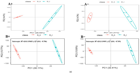 (a) Comparative PCA and PLS-DA analysis of positive (A+ and B+) and negative (A− and B−) ionic mode detected fecal metabolites of the lactating ewes fed D_h = high and D_I = low dietary protein levels; (b) comparative volcano plots of positive (E+ and F+) and negative (E− and F−) ionic mode detected fecal metabolites of the lactating ewes fed D_h = high and D_I = low dietary protein levels.