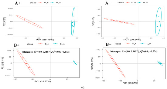 (a) Comparative PCA and PLS-DA analysis of positive (A+ and B+) and negative (A− and B−) ionic mode detected fecal metabolites of the lactating ewes fed D_h = high and D_m = medium dietary protein levels. (b) Comparative volcano plots of positive (E+ and F+) and negative (E− and F−) ionic mode detected fecal metabolites of the lactating ewes fed D_h = high and D_m = medium dietary protein levels.