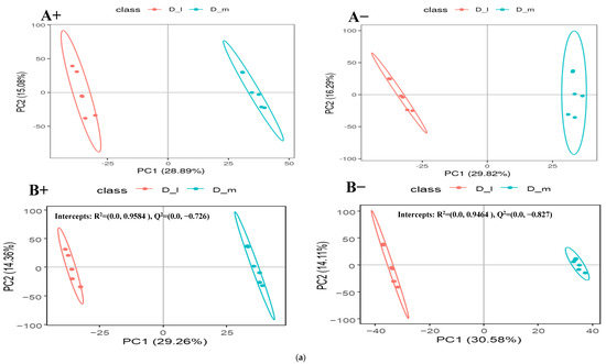 (a) Comparative PCA and PLS-DA analysis of positive (A+ and B+) and negative (A− and B−) ionic mode detected fecal metabolites of the lactating ewes fed D_m = medium and D_I = low dietary protein levels. (b) Comparative volcano plots of positive (E+ and F+) and negative (E− and F−) ionic mode detected fecal metabolites of the lactating ewes fed D_m = medium and D_I = low dietary protein levels.