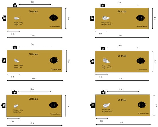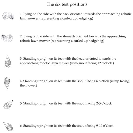 Based on the results reported by Rasmussen et al. (2024) [36] testing the behaviour of live hedgehogs facing a disarmed, robotic lawn mower, each individual was tested in six different positions (Figure 1) in an attempt to mimic the behaviour of a live individual. The most commonly recorded position during the tests on live hedgehogs was “upright position with snout pointing inwards” (43%) [36] which could not be properly mimicked with a dead hedgehog as the head would not bend inwards and stay in place, leaving us to combine this with the second most frequently recorded behaviour (20%), test position 3: