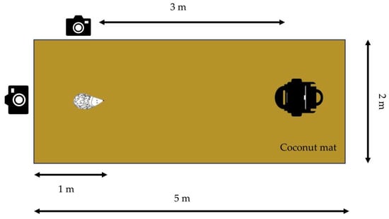 The tests were performed on a firm base of either concrete flooring, garden tiles, (STIHL iMOW 7 and STIHL iMOW 5) or asphalt (Segway NaviMow H3000E (Seqway Inc., Beijing, China) and Stiga Stig-A 1500 (Stiga, Castelfranco Veneto, Italy)), on a coconut mat with a rubber-backed base (dimensions 2 m in width and 5 m in length and 20 mm in height [40]). The coconut mat is the recommended base for the robotic lawn mower safety tests described in the European Committee for Electrotechnical Standardization (CENELEC) protocol [39]. The hedgehog was placed on the coconut mat lying 1 m from the edge of the mat and at a 3 m distance from the robotic lawn mower (Figure 2). The cameras were placed next to the hedgehog on the left-hand side at a 1 m distance from the hedgehog and behind it at a distance of 1 m. The mower was then turned on and manually directed to move towards the hedgehog. The distance of 3 m was sufficient to ensure the machine was operating at maximum speed and the blades were in action before reaching the hedgehog. If the machine did not move in a straight line towards the hedgehog, it was then relocated back to the initial position and turned on again. This was conducted to standardise the tests and to ensure that the hedgehog was located at the centre of the front of each approaching machine. In order to test certain models, the distance between the robotic lawn mower and the hedgehog deviated from the standard 3 m as a longer distance was required before the knives started rotating (3.4 m: Husqvarna Automower ® Nera, Husqvarna Automower ® Aspire R4 (Husqvarna, Huskvarna, Sweden)) or there was a need for a shorter distance to ensure the mower approached the hedgehog at the right angle (2 m: Husqvarna Automower ® 105, Husqvarna Automower ® 305 (Husqvarna, Huskvarna, Sweden), Gardena Sileno Life (Gardena GMBH, Ulm, Germany)).