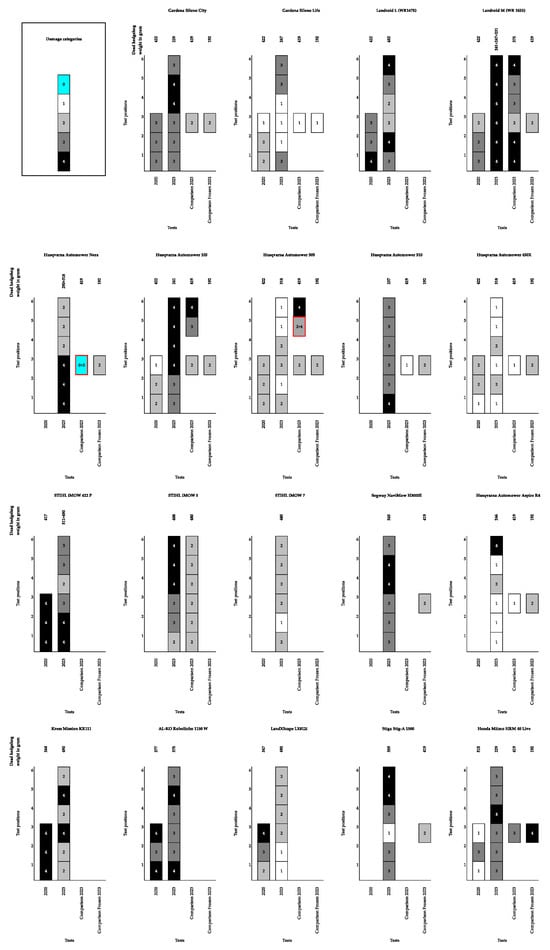 An overview of the test results for each of the 19 tested robotic lawn mowers. The results from the tests performed in 2020 are also visualised for the machines tested by Rasmussen et al. (2021) [26]. The x-axis illustrates the test categories (2020, 2023, comparison, and comparison with a frozen hedgehog), and the y-axis shows the six different test positions. All hedgehog carcasses used in the tests weighed between 250–600 g. The numbers within the fields of the columns denote the damage categories registered for each test position. The numbers above the columns describe the weight in g of the hedgehog carcass used for the specific test. A red highlight marking of the result box (Husqvarna Automower Nera and Husqvarna Automower 305) indicates that this test position and scenario was tested twice and yielded two different results, with colour describing the lowest of the measured damage categories presented in the box.