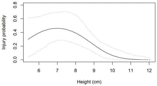 The AIC values showed that out of the three characteristics, height was the most important predictor of injury probability; the model including a quadratic effect of height was considerably better than the one with the linear effect (Table 4). All other models (of weight and circumference) were similar or worse in AIC than the base model. Coefficient estimates from the quadratic height model showed that injury probability initially increased with height but then declined after about 7 cm of height (Figure 4).
