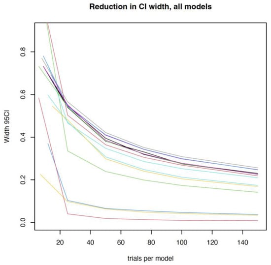 A visualisation of the reduction in confidence interval width (indicating a better representation) as a function of an increased sample size (number of tests) for all 15 robotic lawn mower models included in the analysis. Each mower is represented by a specific colour.