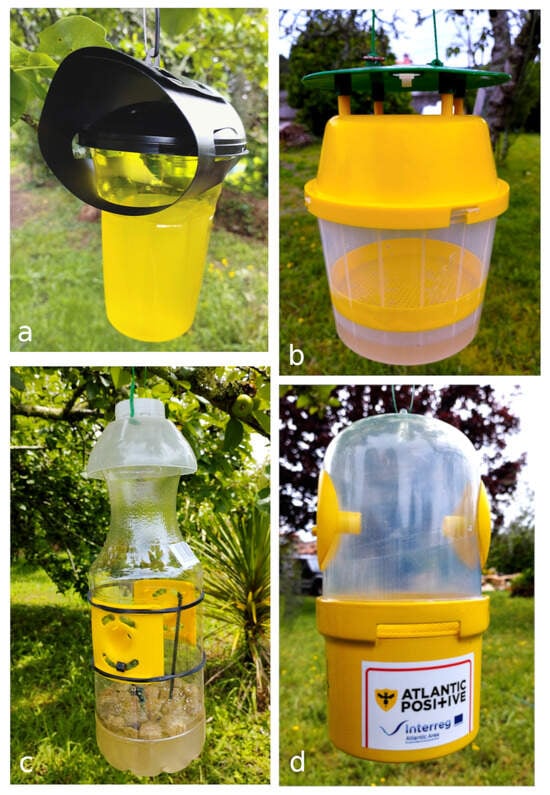 The sampling period lasted from 19 April to 15 July 2022. We tested four types of traps (three commercial and one prototype). The VespaCatch® trap (V trap onwards), Véto-pharma, was sourced from Mel Niño do Corvo, O Rosal (Spain). The V trap has a black lid with two lateral entrance holes and a yellow plastic container that holds the liquid bait, where the insects die by drowning (Figure 1a). The Econex® trap (X trap onwards), Econex, was sourced from Mel Niño do Corvo, O Rosal (Spain). The X trap has a green roof, a yellow lid with a central hole, and a transparent container which is divided by a plastic mesh in two parts, the base of which contains the liquid bait and a main chamber where insects die by exhaustion (Figure 1b). The Eva® trap (E trap onwards), was sourced from Eva, Oviedo (Spain). The trap E has a transparent plastic bottle with two lateral yellow pieces. Each of them has one bigger hole used as an entrance and four smaller holes used as an exit for smaller insects. The trap is provided with expanded clay balls to avoid insect drowning and plastic sticks to allow them to crawl towards the exits (Figure 1c). The insects unable to escape die by exhaustion and/or drowning. The fourth trap was a prototype in the phase of industrial development (R trap onwards. Patent ES1285161U), which has a transparent dome-shaped lid provided with two lateral entrances and a yellow container that holds the liquid bait (Figure 1d). The container is divided by a plastic mesh from the main chamber where insects die by exhaustion.