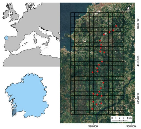 Location of the 24 baited-traps (red dots) used in the study in the southwest of the Pontevedra province, Galicia, Spain. UTM coordinates (zone 29T).