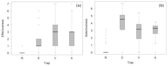 The effectiveness for capturing V. velutina was significantly different among traps (χ2 = 40.85; df = 3; p < 0.001) and season (χ2 = 38.34; df = 5; p < 0.001), but not for the interaction between the type of the trap and the season (χ2 = 9.39; df = 15; p = 0.856). Trap R had the lowest effectiveness across the study, with significant differences in comparison with the effectiveness of traps E, V, and X (Figure 3a and Table S1 in Supplementary material). The capture rate of V. velutina was lower in the second half of April for all traps, with an increasing tendency until the first half of June (Table 1). During the second half of June, the capture rate suffered a decrease and afterward had the tendency to increase in traps E and X.