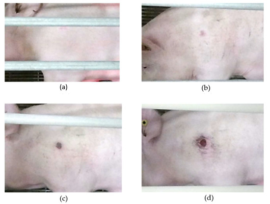 Lesion progression over the farrowing cycle. (a) Lesion in the first week—minimal visible signs. (b) Lesion in the second week—top layer affected. (c) Lesion in the third week—scab formed. (d) Lesion in the fourth week—increased lesion diameter with possible dermis damage.