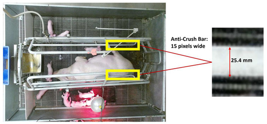 To estimate the area covered by lesions in measurable units, a calibration was conducted using the crate’s anti-crush bar, which was positioned at the same level as the lying sow and at a similar shoulder height, serving as a reference object, as shown in Figure 5. The bar had a diameter of 25.4 mm and was 15 pixels wide. These values were utilized to calculate the area of one pixel in millimeters, which amounted to 2.87 mm2. By applying Equation (3), the lesion’s area was converted from pixels to mm2.