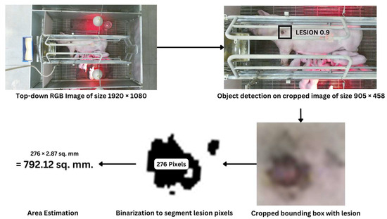 Figure 3 shows a sample image. To minimize computation for training and inference, cropping was applied because the cameras’ positions were fixed, and the animals were confined to the center of the crate. Precise identification of lesion boundaries was crucial for size determination. This was achieved using deep learning-based object detection models, which could detect lesions from sow images for localization and output bounding box coordinates of the lesion within the frame.