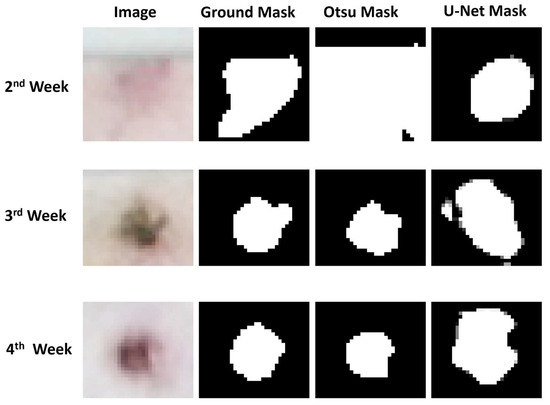 Deep learning-based segmentation models exhibited superior noise handling capabilities, effectively addressing issues like inconsistent illumination and shadows. But, U-Net models were unable to segment pixels well in the later stages, which is in contrast with [13,29,30]. It is worth noting that these studies implementing U-Net for skin lesion segmentation used microscopic images collected under uniform lighting and consistent physical conditions, unlike the conditions in a sow barn. Extending the dataset to include more images from the latter stages of lesion progression may improve the binary mask accuracy, provided there are no hardware constraints. Otsu-based binarization demonstrated strong performance in the later stages of lesion detection with Dice coefficients of 0.83 and 0.82 in the third and fourth week, respectively, where DL-based U-Net models initially performed better.