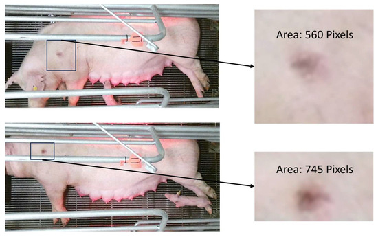 Non-uniform crate lighting and sow movement were two big challenges faced in size estimation. Lesions were only apparent when the sow was lying on its sides. The sows’ movement impacted how the lesion area was viewed by the camera, as seen in Figure 8. The lesion pixel’s color intensity was impacted by the movement which can highly influence the segmentation process leading to variation in estimated lesion pixel count.