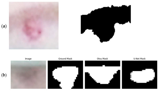 In addition to the sow’s movement, the bars of the crate caused occlusion, which at times made it challenging to accurately localize the lesion as it could become hidden behind these bars. Furthermore, shadows cast by these bars affected the binarization process as shown in Figure 9a. Deep learning-based methods proved more effective at segmenting pixels that included shadows, while traditional binarization techniques like Otsu’s struggled because they sometimes misclassified lesion pixels as shadows, mainly due to the limited difference in pixel intensity between the two (Figure 9b).