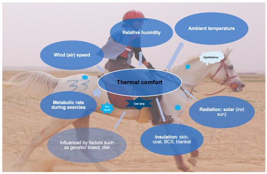 Factors affecting thermoregulation in horses and its feedback control mechanisms including thermoreceptors in the skin (spread over body, examples displayed as bright-blue 6-point stars), and the core temperature receptors (dark-blue 6-point star) which provide information to the hypothalamus (displayed as light-blue call-out), which adjusts the responses either to produce or to lose heat to ensure thermal comfort; BCS: body condition score.