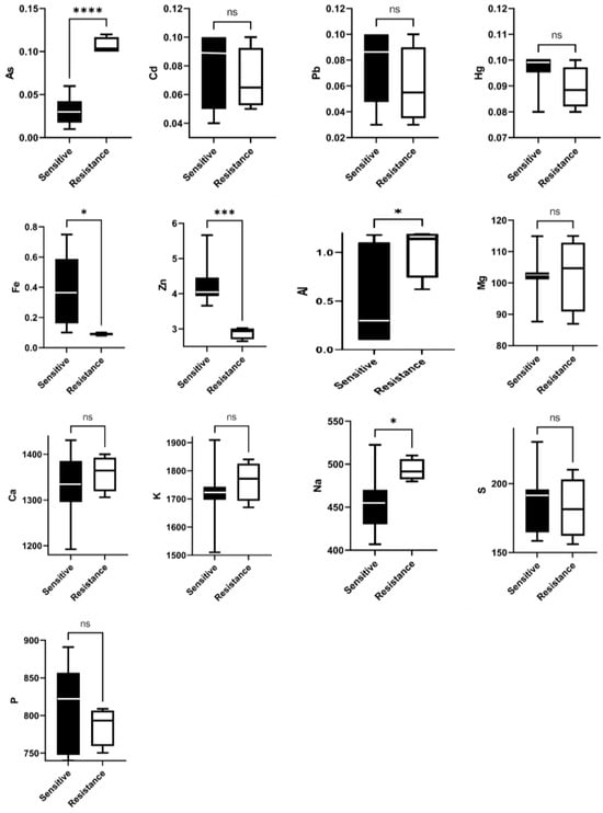 Table 2 provides an overview of the average concentrations of essential and heavy metal in milk samples categorized as either sensitive or resistant to vancomycin. The vancomycin-resistant samples exhibited higher concentrations of arsenic (As) (p < 0.001) and sodium (Na) (p = 0.04), compared to the vancomycin-sensitive samples. Conversely, the concentrations of iron (Fe) (p = 0.03), zinc (Zn) (p = 0.005), and sulfur (S) were higher in vancomycin-sensitive milk samples than in vancomycin-resistant samples (Table 2).