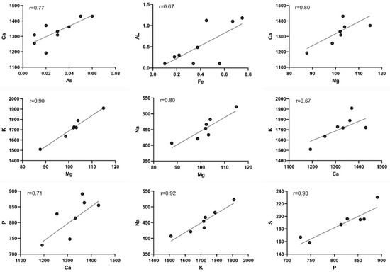 Figure 2 illustrates the correlation coefficients between metal and heavy metal and vancomycin sensitivity. Positive and significant correlations were observed, including As concentration with Ca (r = 0.77, p = 0.01), Fe with Al (r = 0.67, p = 0.03), Mg with Ca (r = 0.80, p = 0.01), Mg with k (r = 0.90, p < 0.001), Mg with Na (r = 0.70, p = 0.02), Ca with k (r = 0.67, p = 0.03), Ca with p (r = 0.71, p = 0.02), K with Na (r = 0.92, p < 0.001) and P with S (r = 0.93, p < 0.001) (Figure 2).