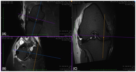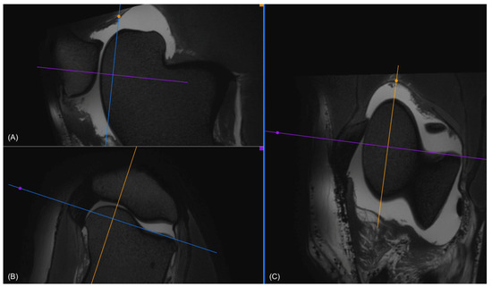 (A) Sagittal, (B) transverse, and (C) dorsal view in 3D VIEW T2-weighted images of a stifle, where the regions of interest (ROIs) were determined for the medial trochlear ridge. In the transverse view (B), the dorsal plane (blue) was oriented to be parallel to the joint space. In the dorsal view (C), the sagittal plane (yellow) was oriented according to the long axis of the medial ridge. This was repeated for lateral and axial measurements by orienting the sagittal plane (yellow), according to the long axis of the lateral ridge and the trochlear groove, respectively.