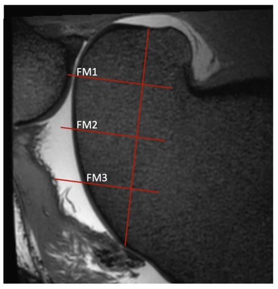 Sagittal view of a T2-weighted image of the medial trochlear ridge of a stifle, as determined by the procedure described in Figure 1. Three regions of interest (ROIs) were defined. In the sagittal view, a line was drawn from the notch where the trochlea ends and the condyle starts up to where the trochlear cartilage ends. This stretch was then quartered, resulting in three lines perpendicular to the original line. Where these lines intersect with the articular cartilage, ROIs (FM1, FM2, and FM3) were determined and the cartilage thickness was measured. The same process was repeated for the lateral dorsal view in the respective sagittal planes. For the lateral measurements, the middle of the origin of the lateral digital extensor tendon was used as the starting point of the vertical line and the proximal edge of the cartilage as the end. For the trochlear groove, the distal and proximal cartilage edges were used as starting and end points. As on the medial trochlear ridge, these two lines through the lateral trochlear ridge and the central groove were quartered with lines perpendicular to the first, resulting in three ROIs each.