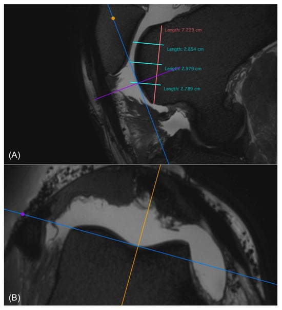 (A) Sagittal and (B) transverse view of the trochlear groove in a 3D T2-weighted image where the regions of interest (ROIs) were determined. The ROIs are marked as described in Figure 1 and Figure 2 (A). To measure the cartilage thickness in the transverse image (B) at the same ROI, the cross of the transverse (purple) and dorsal (blue) planes was placed at the ROI in the sagittal view (A). This automatically places the plane cross on the same ROI in the transverse view (B). Care was taken to place the transverse plane (purple) perpendicularly to the cartilage surface at the point of measurement. This was carried out for all ROIs in the femoropatellar joint. For the femorotibial joint the dorsal view was used instead of the transverse.