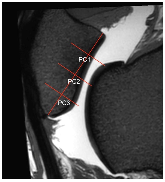 Sagittal view of the central ridge of the patella in a 3D T2w VIEW sequence where the regions of interest (ROIs) PC1, PC2, PC3) were measured. To determine the ROIs of the patellar cartilage, the same sagittal orientations were used as for the trochlea (Figure 1). In the transverse view, the dorsal plane was adjusted to be parallel to the patellar joint surface at the specific ROIs. This was readjusted for the ridge and each groove of the patella to account for the different orientations of the joint surfaces. In each sagittal view (grooves and ridge), the articular surface of the patella was divided into quarters, resulting in three ROIs per slice.