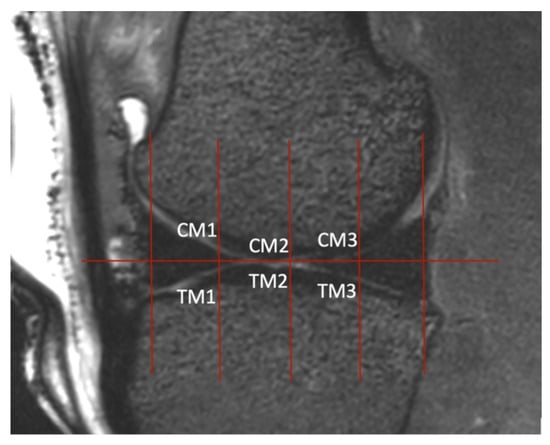 Sagittal view of the medial femorotibial joint in a 3D T2-weighted VIEW image where the regions of interest (ROIs) were determined. The sagittal plane was set as described in Figure 5. In this view, two lines were drawn. The first one passed vertically through the largest extent of the cranial aspect of the meniscus and the second passed through the caudal aspect. The distance between these two lines was quartered by drawing three lines that were parallel to the first two. Where these lines intercepted the cartilage, the thickness was measured (ROIs CM1, CM2, CM3, TM1, TM2, TM3). This was carried out for the lateral femorotibial joint as well.