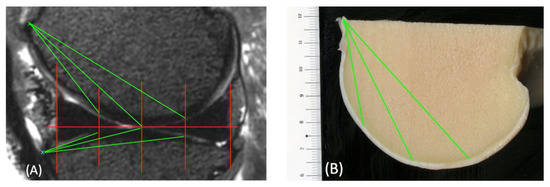 Sagittal view of the medial femorotibial joint in a 3D T2-weighted VIEW sequence (A) and the condyle in a macroscopic scan (B), with marked regions of interest (ROIs, red lines). The base of the condyle (green x) is marked. From this point, the distances to each ROI were measured (green lines). This distance could then be used to find the corresponding ROIs in the macroscopic scans. The same was carried out for the tibia using the tuberositas tibiae (blue x) as the reference point.