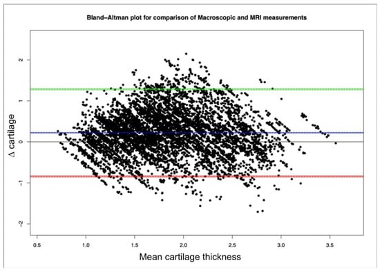 The database was established in Microsoft Excel. The distribution of data for continuous variables was assessed for normality by use of the Kolmogorov–Smirnoff test. Results were reported as the mean ± standard deviation for variables with a parametric distribution (and median (range) for variables with nonparametric distributions). The mean differences between the measurements of the macro slices and those of the MRI sequences were calculated. This mean difference was referred to as ∆ cartilage. ∆ cartilage was analyzed using a Bland–Altman plot, plotting the ∆ cartilage against the mean cartilage thickness (Figure 8). A multivariable regression model with random effects was performed to determine which factors affected the differences in ∆ cartilage. Random effects was used as there were repeated measurements for each ROI. All statistical analyses were performed with commercially available statistical software programs (R Core Team (2016); R: A language and environment for statistical computing; R Foundation for Statistical Computing, Vienna, Austria; URL: https://www.R-project.org (accessed on 23 September 2021); using the MASS, car and lme4 packages and SPSS Inc., Chicago IL, USA) and a p-value < 0.05 was considered statistically significant.
