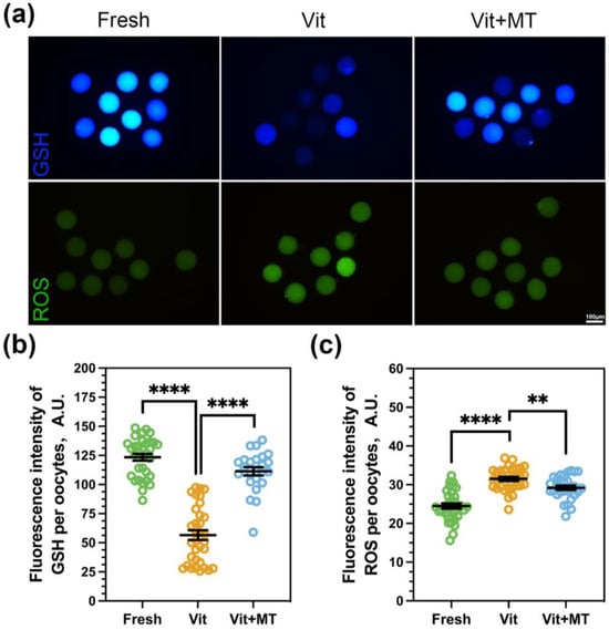 Effects of Mito-TEMPO on the redox status of vitrified oocytes. (a) Levels of ROS and GSH in oocytes across various groups, scale bar = 100 μm; (b) The fluorescence intensity of the GSH signal in the fresh (n = 33), vit (n = 33), and vit + MT (n = 24) groups; (c) the fluorescence intensity of the ROS signals in the fresh (n = 34), vit (n = 31), and vit + MT (n = 29) groups. ** p < 0.01, **** p < 0.0001.