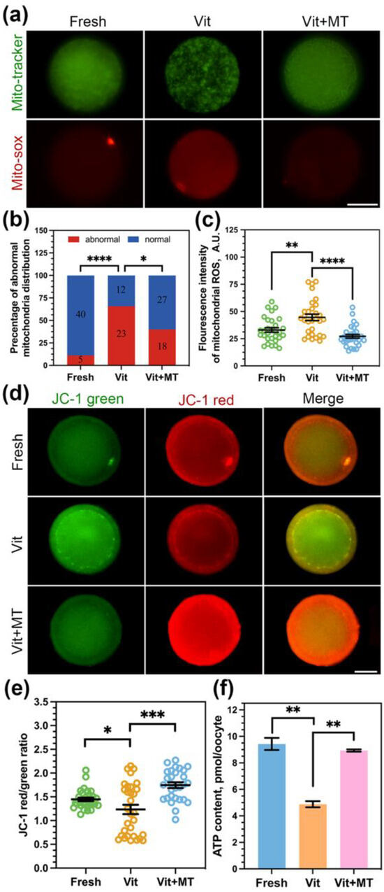 Effect of Mito-TEMPO on mitochondrial function in vitrified oocytes. (a) Representative images of mitochondria distribution and mitochondrial ROS levels in different groups; (b) rate of abnormal mitochondria distribution in fresh (n = 45), vit (n = 35), and vit + MT (n = 45) groups; the number represents the number of oocytes used in this experiment; (c) the fluorescence intensity of mitochondrial ROS signals in the fresh (n = 30), vit (n = 30), and vit + MT (n = 30) groups; (d) mitochondrial membrane potential was detected by JC-1 staining; (e) quantification of the mitochondria membrane potential level in the fresh (n = 30), vit (n = 31), and vit + MT (n = 29) groups; (f) oocytes ATP content was measured in the fresh (n = 40), vit (n = 40), and vit + MT (n = 40) groups. Scale bar = 50 μm. * p < 0.05, ** p < 0.01, *** p < 0.001, and **** p < 0.0001.