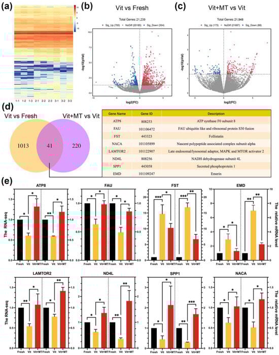 Impact of Mito-TEMPO on the transcriptome profiling of vitrified oocytes. (a) The heatmap illustrates the gene expression of the fresh (1-1, 1-2, and 1-3), vit (2-1, 2-2, and 2-3), and vit + MT (3-1, 3-2, and 3-3) groups oocytes; (b) the volcano plot shows DEGs (downregulated, blue; upregulated, red) in the vit group vs. the fresh group; (c) the volcano plot displays the DEGs (downregulated, blue; upregulated, red) in vit + MT group vs. the vit group; (d) the Venn diagram represents the common DEG distributions (some DEG information is listed); (e) the verification of expression the levels of the DEGs were verified by RT-qPCR; * p < 0.05, ** p < 0.01, and *** p <0.001.