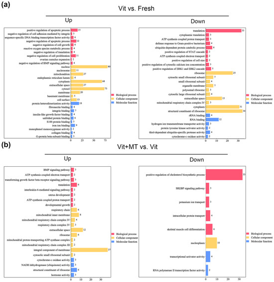 The GO enrichment analysis of DEGs in different groups. (a) Analysis of DEGs that were upregulated and downregulated in the vit group vs. the fresh group; (b) analysis of DEGs that were upregulated and downregulated in the vit + MT group vs. the vit group. Red represents biological processes, yellow represents cellular components, and blue represents molecular function.