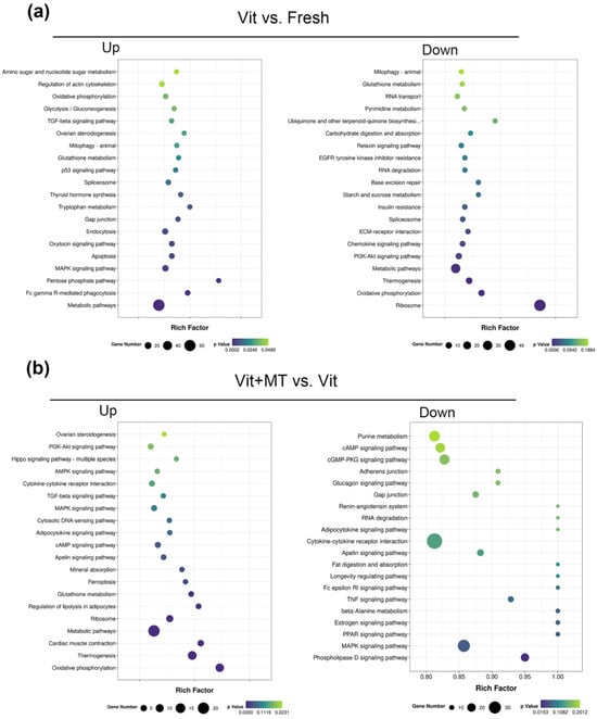 KEGG enrichment analysis of DEGs in different groups. (a) Analysis of DEGs that were upregulated and downregulated in the vit group vs. the fresh group; (b) analysis of DEGs that were upregulated and downregulated in the vit + MT group vs. the vit group.