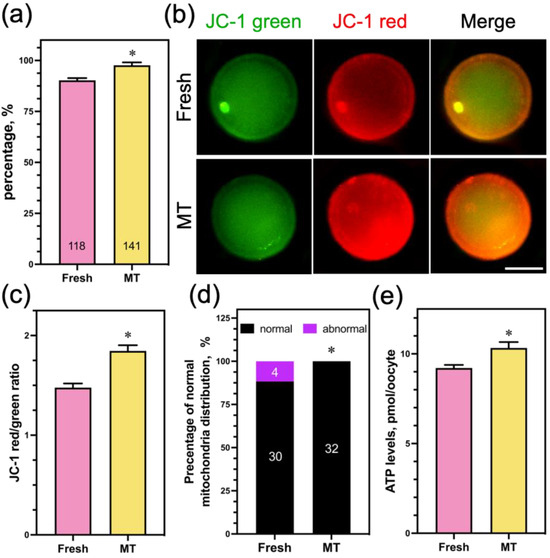 Effect of Mito-TEMPO on fresh oocyte mitochondrial function. (a) The rate of PB extrusion; (b) mitochondrial membrane potential was detected using JC-1 staining; (c) quantification of the mitochondria membrane potential level in the fresh (n = 25) and MT (n = 23) groups; (d) rate of normal mitochondria distribution in the fresh (n = 34) and MT (n = 32) groups; (e) oocytes ATP content was measured in the fresh (n = 4 0) and MT (n = 40) groups. Scale bar = 50 μm. The data are presented as the mean percentage (mean ± SEM) of at least three independent experiments; the number represents the number of oocytes used in this experiment; * p < 0.05.