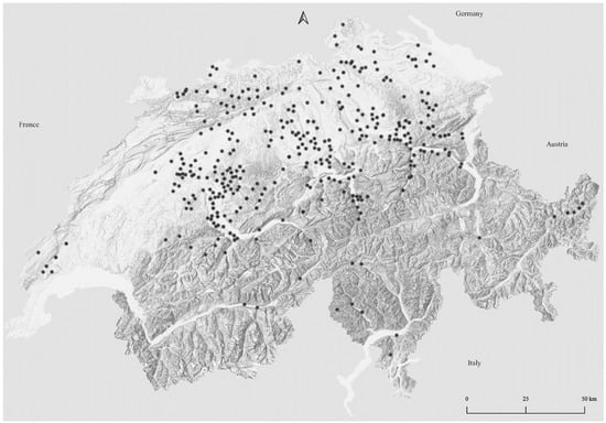 Cattle farms enrolled in this study were located in 24 of the 26 districts in Switzerland (Figure 1). Most farms were located in central Switzerland, while the French-speaking western and mountainous regions were under-represented. Since 2019, professional hoof trimmers have continuously been invited to participate in the government-initiated programme “Healthy claws–the foundation for the future”, which is headquartered at the Vetsuisse-Faculty of the University of Bern [1,21,24]. The study farms were recruited by the respective hoof trimmers joining the project or by farmers that contacted project members and were then assigned to a project hoof trimmer.
