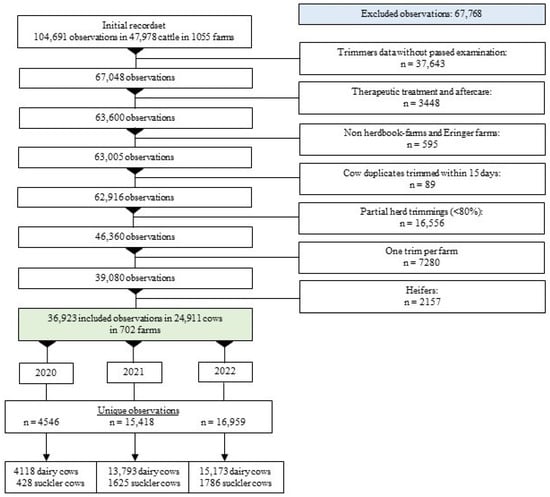 Flowchart showing the exclusion cascade of observations and the final allocation thereof to the years 2020 to 2022 for the calculation of the prevalence of alarm lesions of the digits in Swiss cows (n = number of cattle; suckler cows = cows in cow–calf operations).