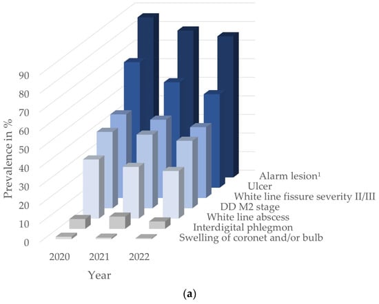 Since hoof trimmers were not trained in lameness scoring, and because the software did not allow the insertion of lameness scores, these data are missing [1,32]. However, not all ALs result in detectable lameness [10,13]. In addition, lameness can be caused by disorders proximal to the digits [10,13]. A previous study conducted in Switzerland reported a lameness prevalence of 14.8% from 1449 cows on 78 farms assessed by veterinarian authors during routine trimmings, whereas in the present study, in 2022, 12.2% of all cows had an AL and might, therefore, show signs of lameness [13].