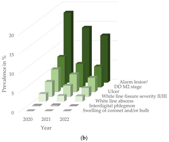 Graphical representation of the herd (a) and cow (b) prevalences of alarm lesions of the digits in Swiss cattle herds for the years 2020 to 2022. 1 Alarm lesion: (a) herds with at least one cow with an alarm lesion present and (b) cows with at least one alarm lesion present.