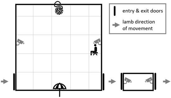 This test was used to measure human-directed fear responses and was based on a modified version of a forced approach test [10,19] with an additional modification. As a moving human could prompt highly reactive lambs to sprint across the arena and jump against the walls, this study used a stationary human to ensure the safety of both the lambs and the human. After the lamb/s had been in the arena for 30 s, an unfamiliar human quietly entered, moved slowly 2.5 m to the centre of one wall, and sat on a small stool they had carried in with them. Timing began once the human was seated and continued for 4 min. The human looked at a position on the ground approximately 1 m in front of them and did not move, even if approached or nudged by a lamb. After 4 min, the human quietly stood and slowly exited the arena with the stool.