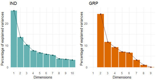 Scree plots for each social condition indicate four principal components should be retained for the IND condition (total 18 behaviours) and three for the GRP condition (total nine behaviours).
