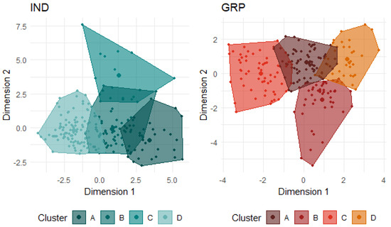 Clustering of the IND data and GRP data each indicate four groups of lambs based on similarities and differences in the expression of behaviours in the respective social conditions. Dimension 1 approximates the first principal component (PC) from each respective dataset and dimension 2 approximates the second PC.