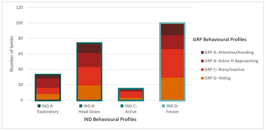 A comparison of the behavioural profiles identified from the IND (x axis) and GRP (stacked) testing conditions illustrates the number of lambs that fall into each profile combination. For example, of the 32 lambs classified as A: Exploratory in the IND condition, four were classified as A: Attentive/Avoiding in the GRP condition, 12 as B: Active human approaching, eight as C: Wary/Inactive, and eight as D: Hiding.