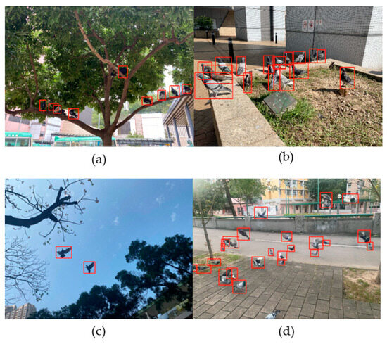 - The use of deep learning network algorithms for bird recognition has consistently demonstrated strong performance [43,44]. However, there are several limitations in current bird detection methods. Firstly, the utilization of traditional backbone networks in two-stage detection approaches [45,46] hinders the maximization of network performance in bird detection. Secondly, most existing studies on bird detection using deep learning techniques lack a specific focus on individual bird species, such as feral pigeons. Some studies concentrate on the accurate identification of various bird species in airborne scenarios [14,15,24,46], while others explore the classification and detection of different bird species in natural environments, such as wind farms or aquatic habitats [19,45]. Additionally, a few studies specifically investigate the detection and counting of different bird species in specific regions, such as birds on transmission lines [18]. Moreover, extensive resources are required for traditional feral pigeon research in urban environments [47], and the limited urban pigeon detection focuses only on specific areas such as buildings [48]. There is currently no comprehensive study on feral pigeon detection in complex urban settings. To address these challenges, we propose an automatic detection method for feral pigeons in urban environments using deep learning. Through a series of experiments, we demonstrate the effectiveness of our proposed method in feral pigeon detection in urban areas.