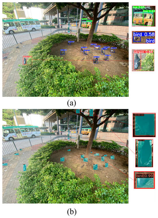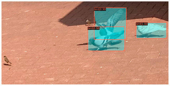 - In bird detection, most studies have utilized one-stage (YOLO) [15,17,19,21] and two-stage (Faster R-CNN and Mask R-CNN) [43,44] object detection models. The original Mask R-CNN has demonstrated great performance in bird detection [37]. Based on this, we propose an improved algorithm that enhances the main components of the original Mask R-CNN and incorporates the SAHI tool to improve the model’s detection performance. Recent studies have shown the effectiveness of the Swin Transformer in capturing fine-grained animal details [49,50]. Therefore, we replace the backbone of the original Mask R-CNN with the Swin Transformer and add FPN as the network’s neck for multi-scale feature fusion [51]. After adjusting the network, to evaluate the performance of the Swin-Mask R-CNN model, we compare it with commonly used object detection methods for bird detection, including YOLO [16,18,19,21], Faster R-CNN [45], Mask R-CNN [46], and our proposed method (Swin-Mask R-CNN) on our feral pigeon dataset. The mAP of our proposed Swin-Mask R-CNN model reaches the highest value of 0.68. These experimental results demonstrate that by applying various bird detection models and the Swin-Mask R-CNN model to feral pigeon detection, our model achieves the best performance. Moreover, although using Swin-Mask R-CNN as the architecture yields optimal results in the previous comparative experiments, there is still room for improvement in detecting small objects of birds (AP50s). There are specific studies focused on the detection of small objects of birds [15,46]. Therefore, to further enhance the accuracy of detecting small objects of feral pigeons, we introduce the SAHI tool [30] to assist inference processing. In this phase, we incorporate the SAHI tool into all the models involved in the previous experiments and conduct further experiments on our dataset. The experimental results demonstrate that our Swin-Mask R-CNN with SAHI model significantly improves the accuracy of feral pigeon detection, achieving the highest values in mAP, AP50, and AP50s with improvements of 6%, 6%, and 10%, respectively.