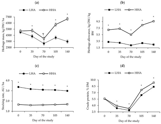 Herbage mass (a), herbage allowance (b), stocking rate (c), and crude protein (d) of pastures provided to beef cows from day 0 to 150 (5 cows and 7.5 ha/pasture). Treatments consisted of two herbage allowances during pregnancy: low (LHA; 2.80 kg DM/kg of BW) and high herbage allowance (HHA; 7.60 kg DM/kg of BW). Treatments were provided to cows from day 0 to 150 (150 ± 11 d prepartum until parturition). On day 150, all cow–calf pairs were combined in a single group, transferred to a single pasture (10 ha), and managed similarly with free choice and access to trace mineral salt supplementation until day 390. Values with asterisks (*) are significantly different (p ≤ 0.05), and Ƭ represents a tendency to be different (p = 0.08).