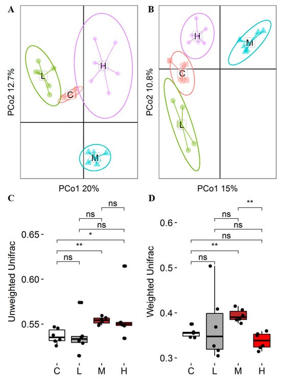 Beta diversity analysis of rumen microorganisms in the four groups. PCoA of rumen microbial composition based on unweighted (A) and weighted UniFrac (B). Unweighted (C) and weighted UniFrac (D) analysis box diagram. “ns” represents p > 0.05, “*” represents p < 0.05. “**” represents p < 0.05. C = CG, L = LG, M = MG, H = HG.