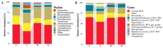 Flora composition of rumen microorganism at phylum (A) and genus (B) levels. C = CG, L = LG, M = MG, H = HG.