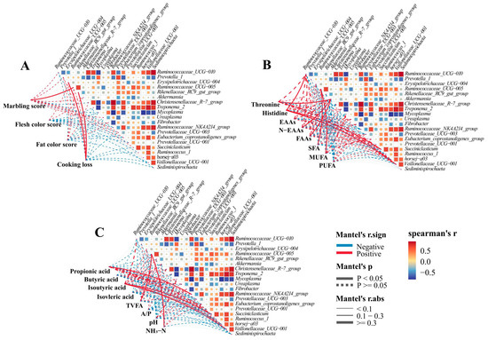 The correlation network heatmap between carcass quality (A), muscle amino acids and fatty acids (B), rumen fermentation (C), and the relative abundance of the top twenty genera is shown. The Spearman rank correlation coefficient is >0.5 or <−0.5. The red line represents a positive correlation coefficient, while the blue line represents a negative correlation coefficient. The actual situation of the straight line indicates significance, and the thicker the straight line, the greater the correlation. In the middle heat map, the red squares represent positive correlation, while the blue squares represent negative correlation. The size of the squares and the intensity of the colors reflect the strength of the correlation. In the legend on the right, different color ranges represent different correlation coefficients. EAAs: essential amino acid; N-EAAs: non-essential amino acids; FAA: flavor amino acids; SFA: saturated fatty acids; MUFA: monounsaturated fatty acids; PUFA: polyunsaturated fatty acids; A/P: acetic acid/propionic acid. The same is below.