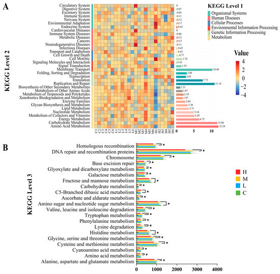 PICRUSt functional prediction KEGG Pathway L1, L2 hierarchical classification heatmap and bar chart (A); the color corresponds to the Z value calculated after normalizing the relative abundance of the function. The closer the color is to red, the greater the abundance; 4 groups Pathway L3 hierarchical metabolic pathway bar chart (B). “*” represents p < 0.05. C = CG, L = LG, M = MG, H = HG.