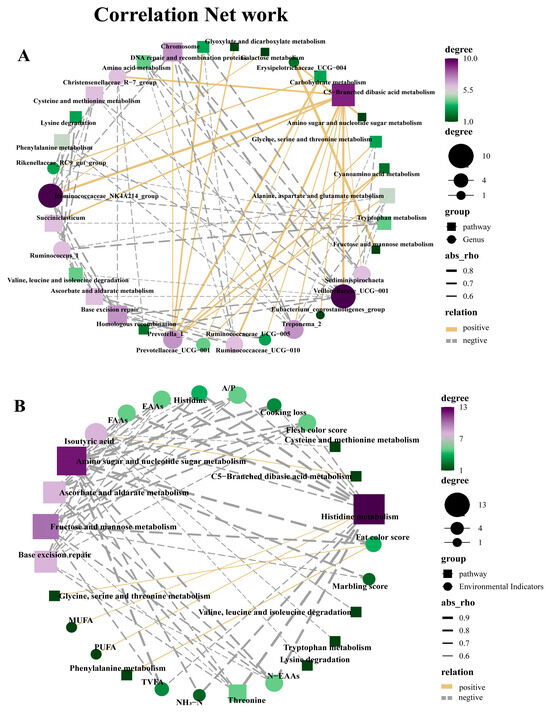 Analysis of the correlation network between KEGG Leve3 and carcass quality, rumen fermentation (A), and the top 20 microbial genera (B). The square in the figure represents the pathway, while the circle represents the genus or environmental indicator. Their size and color depth (green to purple) represent the degree of the relevant objects in the legend on the right. The purple and green nodes represent their centrality. The lines connected to nodes indicate significant correlations between species, and the thickness of the lines indicates the strength of the correlation. (|r| > 0.5, p < 0.05), gold and silver represent positive and negative correlations, respectively.