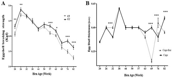 Comparison of eggshell resistance (A) and eggshell thickness (B) from conventional cage (CC) and cage-free (CF) housing systems of experimental 20–82nd-week data are presented as the means ± SEM (n = 180/system/week). * p < 0.05; ** p < 0.01; *** p < 0.001 (Student’s t-test).